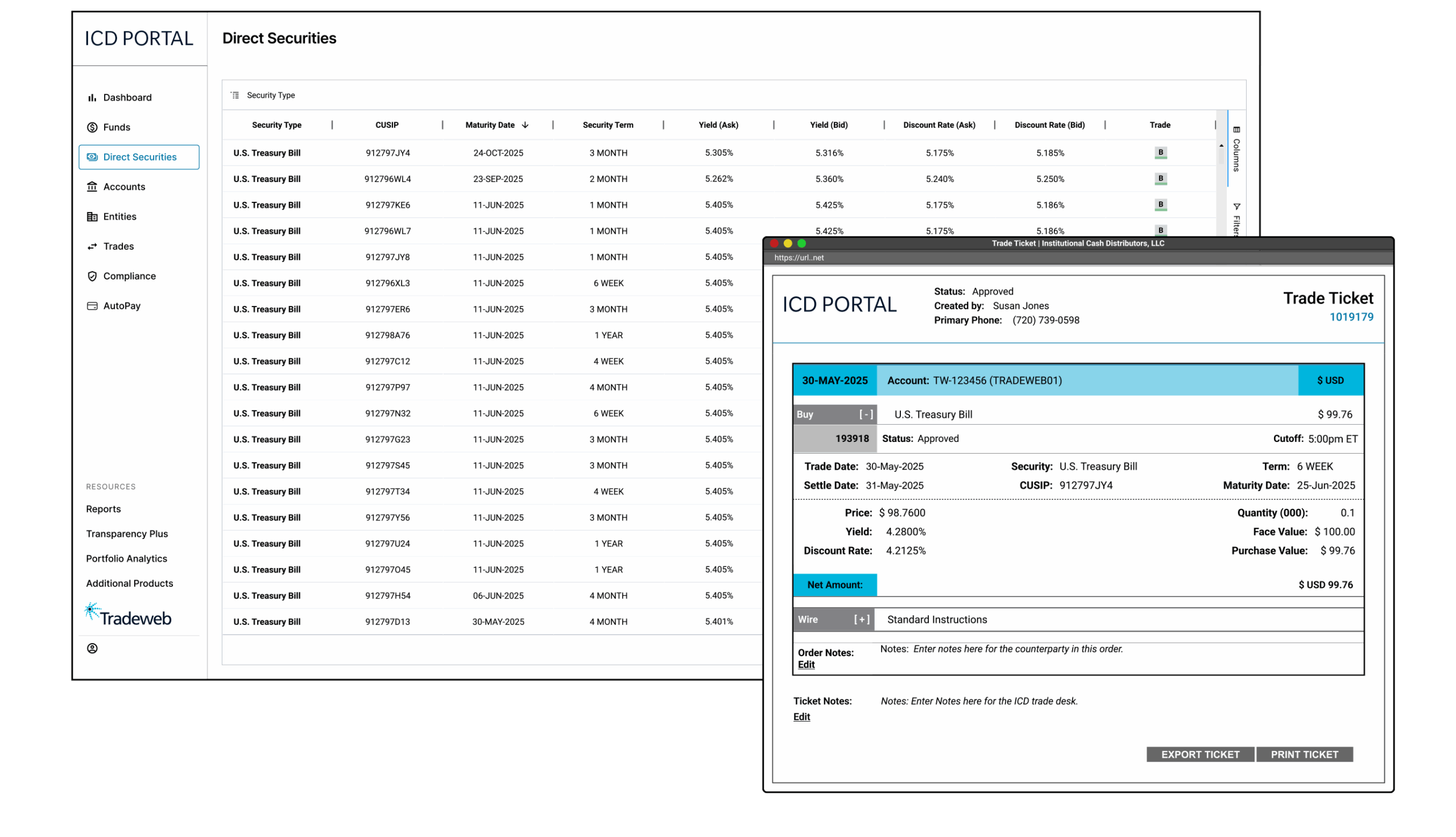*Tradeweb Direct is the premier fixed income trading venue for buy-side investors to access fast, reliable execution and portfolio analytics. Tradeweb Direct is available for use among ICD Portal clients as required for T-Bills trading and investing.